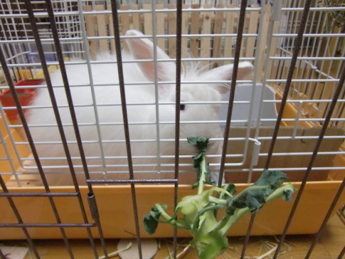 モコナの看病に専念し、5月半ばからブログ休止していました。たぶん慌ててバナー貼ったから・・・行が詰まる操作してしまいました 看病と言っても、付き添って励ますだけですが。 病院は、近所の犬の病院で聞いたので、尿検査します。と言われ、その時、テスターに採取して持っていったモコナの尿がほとんど 水そのままでした。1日に500ミリリットルのボトル2本で足りませんでした。『うさぎの腎不全を治す治療が無いので、1ヶ月後、尿の検査に来てください。』それだけ。不治の病の可能性が高い という診断でした。別の病院に行かなきゃと思いましたが、モコナ、ずっと水を飲んでは、オシッコしていて、こんなに頑張っている子を遠くの病院に連れて行って疲れさせるのは今は悪影響だと思いました。モコナの実家、パピーファームで気になっていた、<みどりむし>のサプリ(粉)を使ってみようと、藁にもすがる思いで購入しました。最初、ペレットにふりかけたのですが、粉が下に残ってしまいました。それで、モコナの大好きなウサギ用ウエハースにサンドしたら・・・2日目から、グングンよくなって1週間ほどで、腎不全が治ってしまいました。腎不全という診断でしたが、毒出しの為に、大量に水を飲んでいたに違いありません。うさんぽの時、食べた野草に毒(農薬等)がついていたか、うさぎにとって有害な植物を食べた・・・としか考えられません。↑は間違いでした。訂正までに長い月日を越えてごめんなさい。自宅の壁紙を食べていたのが原因かと思います。モコナは今も多飲多尿ですが、元気に食べて運動して頑張っています。5月2日で4歳になります。モコナ『ブロッコリーやセロリ、みずな、イチゴ、りんごで水分採ると水を飲む量が少し減って、元気だよ。ナデナデして励ましてもらってるよ^^U』2014.4.25(金) みどりむしのサプリ人間用もあるそうです。長生き、若返りのサプリですが、ホルモンのバランスが崩れている可能性もあったので、きっと効果があったと思います。 モコナ、病気にさせてしまってごめんね。でも、すっかり元通り元気になりました。モコナ、よかったねがんばってくれてありがとう パピーファームの通販のプレゼントでもらったうさぎのドール サロペット着てる男の子のぬいぐるみに胸キュン^^これは前々回もらいました。前回はうさぎの湯のみ。 パピーファームさん、モコナを助けてくれて本当にありがとうございました。 応援いっぱいありがとうございます