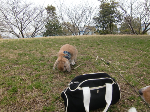 人生って、楽しいことも辛いこともあるんダジョ<^Vモコナが辛い時には、美味しいものと、僕らの出番ダジョ! アール兄ちゃんは、モコナをとても心配しています。 1番モコナに優しい子はアールです。すばらしいお兄ちゃんです。クリスティーもとても優しいですが、アールに任せてるのかな?まるで上司です。アールはいたずらっ子だったけど、家族想いで、我慢もします。クリスティーも我慢しますね。ワンちゃんは、申し訳ない程、我慢強い動物です。 部屋を乗っ取られた可哀想なモコナに気分転換してもらえるようにアール兄ちゃんと海公園にお散歩してきました。(クリスティーは発情期が終わっていないので出歩けません。) 今日は、暖かめでしたが、寒い思いをしないように、うさぎの湯たんぽ、重いけど入れて、バッグで出掛けました。おでかけカートもありますが、一人で犬のリードとカートは余計大変かもと思い、ちょっと湯たんぽが重いけど、バッグにしました。(モコナは軽いです。) もっと可愛い写真も撮ったのですが、(3000×4000画素の分)後ほど、写真館に登録して、また後日載せます。うさんぽ頑張ったので、気分転換できたと思います。モコナ、ゆっくり体と頭を休めてね いつも応援ありがとうございます。ホーランドロップアウトランキング順位上昇中(18位ぐらい)なのでアウトランキングが見れるバナーも作りました