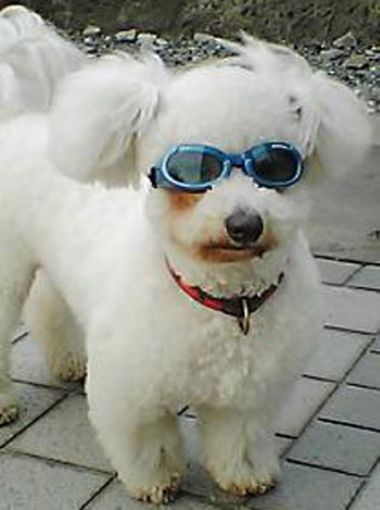 ビションフリーゼのレタスちゃんは鼻涙管の病気で犬用サングラスを掛けています。DOGGLES(ドーグル)がとても似合っているレタスちゃん。みんなと遊べるようになってよかったね早速、レタスちゃんの歓迎の体当りをドスーンと受けました(ダッシュで走って来てぶつかって行く)久々~ビックリ 元気になった証しだね早く病気が治って綺麗なお顔に戻るといいね。 突然ですがクイズですこのわんちゃんは誰でしょうおもしろ写真が撮れたので載せてみました(ママの許可を得てます)ヒントはミドルネームがアンジェラーちゃんです。足が速い女の子です「僕ちゃんも○○ちゃんみたいに走るの速くなりたいよ~」モデナはいつもビリだもんね~