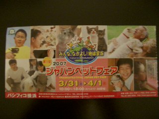 東京の桜は満開桜を見ながらお食事が出来るレストランは長蛇の列でしたガッカリ昼ご飯を諦めて、クーちゃんママから誘われていたパシフィコ横浜で行なわれている2007ジャパンペットフェアを見に行く事にしました。残念2!クーちゃんママにとは行き違いで会えませんでした 突然、会場入り口で見知らぬおば様からペットフェアーの招待券を頂きました。ラッキー★髪型はお蝶婦人風でマスクをしたデニムパンツ姿の私に、招待券をくださった方有難うございます、助かりましたこのブログを偶然見ていたらうれしのですが.....会場内はおしゃれをしたわんちゃんがいっぱい見に来ていましたよ。モデナ君の2台目カートの試乗中!(目と鼻描いちゃった)会場内唯一の写真、お顔がブレて写ってます。モー君は落ち着きがないので、直ぐに会場からで出て隣の臨港パークで遊ばせる事に後ろにちょこっとだけベイブリッジが写ってます芝生で遊ぶのが大好きなモー君、楽しいね急にお船が見たくなり、ドライブしながらマリーナへみなとみらい→中華街→海の見える丘公園→本牧の桜通り→横浜ベイサイドマリーナへ到着した頃に雨が降ってきたので、またもや直ぐに撤退!東京に戻り焼肉第一神宮麻布十番店でお食事しました。久しぶりの思いつくままのドライブ楽しかったです。今日の反省ペットフェアーで貰ってきた物比べ↓クーちゃんママが貰った モーママが貰った食品サンプル わんにゃんウォーカー宝の山だ~ 1冊だけ モーママはサンプルが有るのを知らなかったのです ||(_ _。)ブルー||