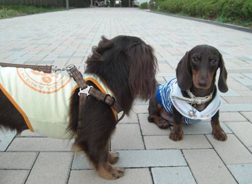 チョコが我が家に来て初めてのお散歩をしました。場所はモデナのホームグラウンド?のミッドタウン。モデナは生後41日から約3年間ミッドタウンの近くに住んでいたのでココに来るとお友達がイッパイいます。キッド君 (左) 「君、モー君の弟?」チョコ (右) 「弟ではないでちゅう、チョコでちゅ、怖い~」まだお散歩に慣れていないチョコは、お外とわんこは怖いみたい。優しいN姫が怖がるチョコを抱っこしてくれました↓↓N姫チョコと遊んでくれてありがとうねまた遊んであげてね体育会系のエマちゃんに嫌がらせ?をしてみました。エマちゃん「モーママ、私ネグリジェ嫌なんですけど」ちょっと怒り気味のエマっちょ似合っているわよエマちゃんまだチョコのお洋服を買っていないのでモー君のを着せてみました↓↓こちらもお洋服を嫌がっていました。お友達と会って水を得た魚の様なモデナバナナを食べたモデナって言った方がイイかな?日が暮れてもズーッと遊んでいました。モデナ 「僕ちゃんミッドタウンに住みたいそしたら毎日みんなに会えるでしょ」モーママもリッツカールトンに住みたいよ~お家賃が・・・