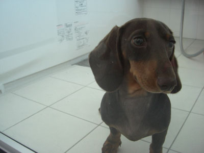 今朝、生後4ヶ月のミニチュアダックス♂ちゃんが我が家にやって来ました。名前はチョコくん、チョコレート色だから。チョコのママが知人にチョコを預けたまま引き取りに来なく、預けられた知人は急な出張と引越しの為しばらくの間モーママが預かる事になりました。チョコのママ → 知人 → モーママ・・・・・・・・・・・・・・・・・・・・・・・・ようこそモー君邸へ、まずは洗礼をしましょう我が家のお決まり、帰宅したら即お風呂↑ ↑モー君邸にわんこのお客様は初めてなので、興奮しつつ不思議そうに見つめるモデナ。ふるえるチョコ。お風呂から上がり、チョコにしつこく付きまとうモデナ。チョコを追っかけて吠えたり騒いだりして全然静かにしてくれないワンコ達。深夜に預かってほしいと電話があり、チョコを寝ないで待っていたので寝不足なモーママ((o(>皿