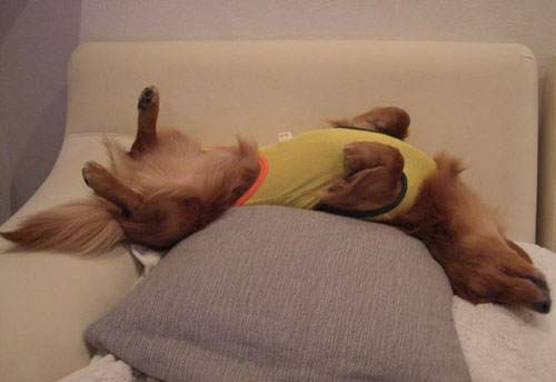 お疲れちゃ~んのモデナ君イナバウアーならぬイヌバウアー姿で爆睡。.:♪*:・'(*⌒―⌒*))) 遊び疲れたのね♪
