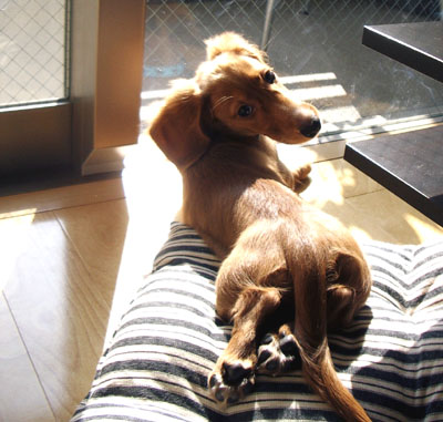 生後3.4ヶ月頃から日向ぼっこをするようになったモデナ君教えてもいないのに、東南の窓から光が差す午前中に日向ぼっこしていました。生後4ヶ月のモデナ↑この時わんちゃんも太陽の光を浴びる事は重要なんだと感じました。4ヶ月のモデナ君とシマウマのエンツォ君↑モデナが赤ちゃんの時はエンツォ君といつも一緒に寝ていました今住んでいる家は北西に窓が有り、冬は光が殆ど入って来ません最近はお昼の2時過ぎ位から光が入って来ますが、とても強い日差しなので日向ぼっこは辛いのではと思うのです。しかし暑い中日向ぼっこをするモー君体が熱くなると冷ましに日陰に行き、体を冷ましてまた日向ぼっこの繰り返しです。モー君にとって日光浴は重要なんですね。 「熱くなった僕ちゃんの事を ホットドッグって言うのやめてよね!」 ホットドッグみたいだし、温かいし、いいじゃな~い