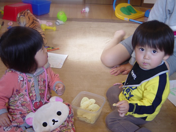 今日は月1のプチママ会がありました。。メンバーは創くん・りょうちゃん・りーたん・とそのママ達。。。最初に公園で遊ばせて・・・・なんて考えてましたが、公園ではあまり遊ばず脱走していってしまって3ペアーの親子は点でバラバラ。。1時間位で切り上げ、目の前のスーパーでお昼ご飯を買いにGOりーたん、カートに乗らないでイナバウアーつこりんママと強制的に乗せギャーギャーなりーたん、つこりんママ助かったよ~~ありがとう~~。さっさと買い物済ませ、いつもお宅を提供してくれるりょうちゃんちへGOこの日はりーたん調子良くモリモリ食べてくれました。。でも創くんがあまり食べなくなってたのにはママちょっと驚きブログで食べないとは書いてあったけど、こんなに食べないんだって。。ママが良くお邪魔してた時はかなり大食いだったのでちょっとビックリ。。でも創くんはりーたんとは違って身長も大きいし元気なのでじゃないかい話し変わってお昼食べてみんなネンネするのかとママ達は待ちわびてましたが。。。ん???おかしい????誰一人一向に寝る気配ナシまたまたお外へ出す事に。。。りょうちゃんちの近所の公園へ~~しかしママ疲れた~~~。結局帰ってきても寝る気配なし。。オイオイみんなどうしたみんなそろってDVD鑑賞。。りーたんはここ2日DVDボーイになってしまい。。テレビっ子にものすごい集中してガン見してます。。ママかなり心配。。リアルテレビっ子になりませんように~~今回はあまり話せなくて残念。。でもまた来月が楽しみだ~~。。