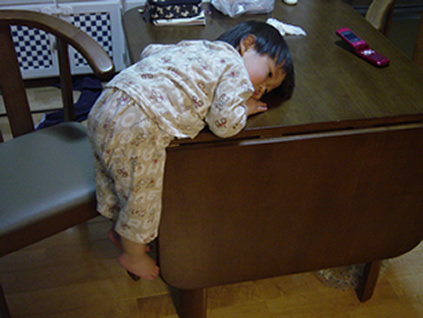 今日は朝からOンチの回数が多かったりーたん。。昼までには6回と・・・・ママはなんかおかしいと思い病院へ行くとウイルス性のものでは無いから一応お腹の調整剤で様子を見ることに。。。とりあえずおかゆかおうどんで。。。でもなかなか治らず。。。良くなったと思い少し調子に乗ってあげるとまたピ~っと。。う~~~ん超かわいそう。。しかもりーたんはおかゆでは物足りないらしくママが食べてると欲しがるので、ママはりーたんの眼の付かない所で(台所のガス台の上とか)でマッハで食事を。。ママは食べた気がしないしない。。こんな日々を丸4日過ごし、5日目から治ってきました。。お~~良かった~~~少々痩せてしまったりーたん。。。でも子供は痩せるのも早いけど太るのも早いから気にはしてないけど。。。↓↓気づけばこんな格好でママ超ビックリ自分で椅子に登ってぶら下がってたみたい。。パジャマ姿で失礼今日はいくらか元気が無い様子。。