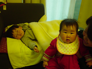 今日のりーたんは昨日に引き続き女の子ちゃんと遊びました。。その名はあさひちゃん。。あさひちゃんもやっぱり夜中に何十回と起きてしまうらしく、夜泣きの大変さについてお互い熱く語り合いました。。でもあさひちゃん、今日は昼寝を1時間位していたのであさひちゃんママは少しゆっくり出来たかも???↓↓帰りがけに記念写真。。リータンおねんね中。。いや~あさひちゃんとこもホント大変そう。。でも最近りーたんはお友達とか自分より小さい子を叩くようになったりやきもちを焼いたりでホントに困ってしまってるママなのです。。しかもげんこつで。。。これはママのプチ悩みかも???