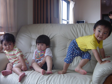 今日は前にもブログに登場してくれた有咲陽(あさひ)ちゃん&あさひちゃんママが遊びに来たよん。りーたんはイイ子イイ子してあげてたよ~~。。ママがあさひちゃんにおもちゃを貸してあげようとするとあさひちゃんから奪い取ったり、途中あさひちゃんに焼もち焼いたりもしたんだけど。。。でも自分から貸す分にはOKみたい良く分からんね~~。。やっぱりあさひちゃんは寝無いね~~~。。こりゃ~寝無い選手権やったらりーたんの狂的なライバルだ~~さてさてあさひちゃんママは元スポーツトレーナーだよん。。六本木ヒルズのフィットネスジムでヒルズ族相手に教えていたんだって。。やっぱり会話が違うらしい。。ひょえ~~~。。雑誌のヨガ特集にも載ったことがあるんだよ。。ママ、その小冊子もらって見たんだけどカッコよかった~~。。今日は特に鍛えるって感じではなく、食料品を買いに行ったりちかじか引越しする共通の友達のプレゼントを買いに行ったんだけど、り~たんは・・・超連発のイナバウア~~。。もうかれこれ何回披露したか泣きまくるはグズルはで。。。ママ、マジお手上げでございました。。もう買い物がホントできなくなってきてるよ~~真剣に。。。最後に三人でハイチーズちなみにあきちゃんは23歳~~。わ、若い。。。ママ脱帽。。