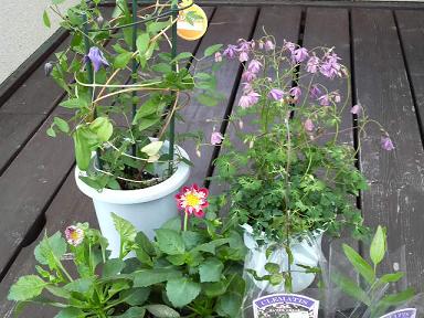 こんにちは。午前中は暖かくいいお天気でしたが、強風が吹き始めました。どんよりとした雲も広がってきてます。また雨が降るのかしら・・・午前中、野菜苗や支柱を買いにHCに行ってきました。この時期の園芸コーナー、華やかですね~。誘惑がいっぱい。。。2時間くらいブラブラしてたかなぁ。気づけばカートの中には野菜苗より花苗や鉢が多い?お花で2000円弱使ってしまったわ・・・ダリア。小さくて安くてかわいかったし。冬越しに自信が無いのでこの辺から始めてみようかと。風鈴オダマキ。あるのにね。5号鉢でお花もたくさんで。ネットで買ったら高いじゃない?とか思ったら手にしてました。これで380円。高いのか安いのか・・・クレマチス。500円なり。育て方もわからないのに買っちゃったよ・・・なんだか、鉢植えで500円て安く思ってしまったのよね。ニオベっていう赤?のクレマチスは1000円でした。欲しかったけど、1000円はちと手が出ない~。他に、メヌエットと白麗の小さな苗。白麗は絡まなさそうよね。そんなに大きくもならなさそうだし。支柱か何かにまとめるのかな?調べなきゃ~。ラベンダーの綿ぼうし。5号鉢植えであったの。すごくかわいくて、これ欲しい!と手にしてみたら。1500円。高すぎますわ(T∇T) 小さなポット苗でいいんだけどなぁ。このHCにはありませんでした。本来の目的の野菜苗もバッチリ手に入れました。今年はちょっと高いけど接木苗。小さな家庭菜園ですから。連作に強いものを、と思ったのだけれど。さてさて。どうなるでしょうね。今日この後植えつけようと思ったんだけれども・・・明日の最低気温4度の予報。寒いよね。植えて大丈夫なのかな?