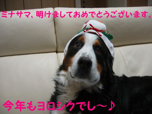 このブログをご覧の と言う訳で気が付いたら年が替わってました なんだかんだで更新も出来ないまま新年を迎えてしまってちょっと凹んでしまった母ちゃんです。 ですが、イヌタチは元気です。当然この方も…。 ご近所のミナサンに頂いたかぶりもので年賀状を作りました。が、なかなか、だいちのアホがじっとしないのでビミョウなカンジでございました。貰ってしまった方、ゴメンナサイ。来年頑張ります 父ちゃんもビックリでしたが始めてかぶせた時に入らなかったんです。それでも、1番大きなサイズを買ってくれたんですがね~お前、どんだけ頭デカイの? でも大丈夫。無理矢理かぶってもらいましたともだって、せっかくもらってさ、しかも「これは、だいちでしょう~」ってカンジのデザインだし 明日は、ちょっともこ達の居住スペースに(父ちゃんが)手を入れる予定です。なので早く寝ようかな~なんて思う母ちゃんでした。←ランキング参加してます。 今年も、マイペースでもこ達との生活を綴っていこうと思っております。どうぞ本年もよろしくお願い致します。 本当は、元旦の日の事も書きたかったんですが、それは次の更新のネタに取っておきます。