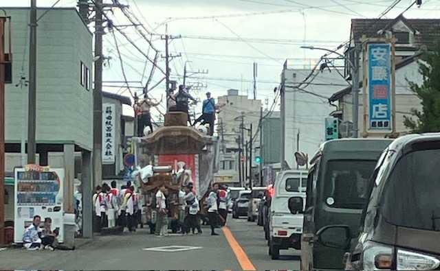 3年に1度開かれる藤枝大祭り。一度も行ったことがないから、と雨模様でしたが、夫について行きました。藤枝市民にとってはとても重要な行事らしく、今は静岡市在住だけど実家が藤枝の同僚、平日が当番だと、有休取ってました。神社に向かう途中。何か渋滞してる。あ、あれのせいか。もう始まってるのですね。通り過ぎたと思ったら、また止められた。こんな時は祭り優先です。神社に着きました。ちょうど原区の屋台が。この先にあるのが飽波神社。ここで屋台はUターン。梃子棒で操作します。お参りして帰りました。この祭りは「日本一の長唄による地踊り」で有名だそうで。それは別の場所で行われるようです。ちょっと漠然としてるな、と思ったのですが、「長唄・三味線・囃子方と、フルメンバーに依る演奏での地踊り」が質・量とも日本一なのだとか。パンフレットを見ると14地区ありましたが、それら全てで三曲は披露可能、というのはなかなか凄いことかなと。傘の花が見送る。なかなか訪れることが出来ずにいたら…既に終わり始めてる。ブログランキングに参加しています。写真多くなったので、食べ物画像はなしで。応援クリックいただけると嬉しいです。