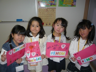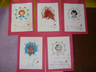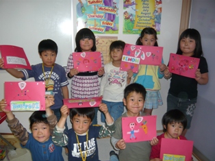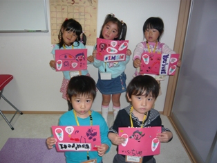 こちらのクラスも元気いっぱい4人そろってレッスンに来てくれました積もり積もった話がたくさんあったようです(笑)。何とか???切り上げてレッスン開始しました(笑)。 レッスン内容 」1~10まで数えるあいさつの歌アクション先生とHELLO! 天気の確認ABCソングroll call数字 1~80まで復習 81~100まで導入Day of the weekの歌 Thursday の導入VOCA 動物絵本Thanks Mother's day カード作りGood bye song今日は皆パワーが有り余って?かなり勢いがあったので100まで入れてみました。後は今月復習して来月から数字を使っていろいろなゲームをしてみましょうね動物のカルタもかなり接戦で白熱していました。数字を言うときにI have ~.と言えるようにしました。カード作りでは、年長さんの女の子らしく丁寧にしあげていました。ラブリーなシールが人気でしたねママが来てくれたときには小さな声で恥ずかしそうに言っていた Thank you,mommy I love you!も練習ではもっと大きな声で言えていましたよ