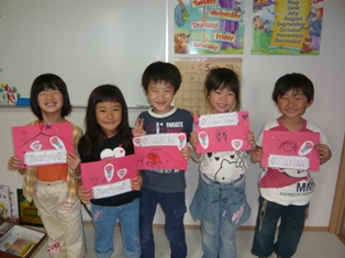 今日も元気に五人のHELLO!が聞こえましたまだ二回目ですがもうすっかりお友達と仲良くなってしまったようで、さすが年少&年中クラス(笑)。声の出し方にはまだムラがありますが、意欲的なのでとても楽しみです レッスン内容 1~10まで数えるあいさつの歌アクション先生とHELLO! 天気の確認ABCsong What's your name?roll call (年齢の確認)VOCA 動物 → マッチングカードを使って。Head shoulders の歌絵本色の復習 → Thanks mother's day のカード作りGood bye song動物は知っている子もいてきちんと発言して他のお友達に教えてあげたりしています。わからないと日本語で伝えます。それがいいと思います。英語も言葉なのでわからないからと言って黙ってしまうより何とか意思を伝えようとする姿勢の方が伸びると思います今日は母の日用にカードを作成しました。途中で私の質問に答えたりしながらそれぞれ頑張って作っていました下には名札を皆がら自分の名前を書いてみました。個性的な文字が出来あがりました(笑)。お迎えに来たときママに Thank you, Mommy!と言ってみました