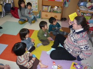 今日はmommy and me金曜日クラス今年度ラストのネイティヴ講師のレッスンでしたNimo先生はとっても穏やかなしゃべり方と表情で、最初玄関先でもじもじしていた女の子も徐々にうちとけていきました。Nちゃんは、始めのモジモジはどこへやら!すぐにいつもの可愛い笑顔を見せてくれ、アクションも上手にできました久しぶりのSちゃんはママにひっついたと思ったらまたカーペットをタッチしに行ったり意欲を見せたりと大忙しでしたね(笑)MちゃんはNimo先生にkoalaちゃんと言われるくらいママにひっついていましたが、時々見られる笑顔から本当は怖がっていないんだろうな、と思います(笑)Sくんも普段通り堂々たる態度でした動物園にはfrogがいる!と笑いをとってくれ皆で泣きマネやジャンプをしましたねMISちゃんは緊張のあまり動けなかったようですが、先生の英語のまねっこが上手でしたわが次男Dは最初いやがっていましたが、レッスンが始まると大きな声で歌ってくれたので良かったです起きた時、歯磨き、洗顔などのアクションをしてZOOへ出発!見つけた動物を子どもたちに言わせてアクションや物まねをしました。それからその動物たちの色を言ってみたり探してみたり・・先生の英語を聞いての反応でしたママの体のあちこちをタッチしてみました。Touch your mommy's head!には届かなかったかな? 今日は大雨の中来てくれたので皆に絵本のプレゼントがありました きちんと列が作れるなんて! 記念写真♪