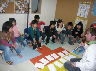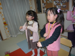 こちらのクラスにもNICK先生が来てレッスンしてくれましたこれで今年度のネイティヴレッスンはすべて終了です前のクラスと違いお兄ちゃんお姉ちゃんになったのかそれとも性格なのか、先生に絡む子がいなくて静かにレッスンが始まるのを待っている感じでしたあいさつはHOくんが手を挙げてやってくれましたレッスンは時間の言い方がメインでそれにそってのゲームや質問で定着するようなレッスンでした。時計を見て何時かの言い方を練習してから、What time do you have breakfast?What time do you go to school?などのたくさんの質問に答えましたboyy vs girlsのゲームは通常通り落ち着きのある女の子が勝ちました(笑)ビンゴゲームも時計にちなんだものだったので楽しみながら定着できたようです。 こちらのクラスもあと3回です。27日は参観日です 自分で考えて答えます。 大きくなったね