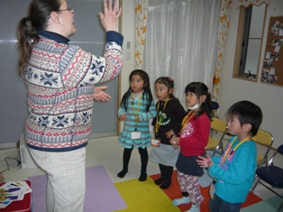 先週は私もM先生もレッスンができなかったのでご迷惑をおかけしてすみませんでした。今週もダウンのお子さんも出たりとキャンセルが出たりして、5人の子供たちとママとでのレッスンでした レッスン内容 1~10まで数えるあいさつの歌先生とHELLO! 天気の確認How are you?の歌先生とHow are you?The ABCsong What's your name?roll call Q&AVOCA 食べ物カードでお買い物ごっこSeven Step の歌絵本 → プレゼントBody Activity 日本語リトミック 鬼さーん (オオカミさんの替え歌)&ボールで豆まきおにぎり作ろうお片付けの歌鬼のパンツぞうさんのあくび回をこなした成果があらわれ、先生やM先生に質問するのもスムーズにできるようになりました自分で質問する単語を考えることも難しいけれど頑張っていますね。お買いものごっこも順番をきちんと守り、他のお友達がやっているときは静かに待てましたM先生のレッスンの「鬼さん」は皆の表情がこわばっていくのがわかり本当に可愛かったです必死にM先生扮する鬼に向かってボールを投げる子、怖さのあまりママに隠れてしまった子、いろいろな反応が微笑ましかったです。先週できなかったレッスン内容を節分が終わってしまいましたが、取り入れたとのことです 再来週の20日のレッスンはMINO先生のレッスンです