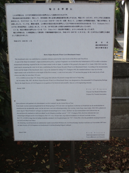 明治政府は、明治5年(1872)オランダから水工技師団を招きました。そのうちの一人、リンド(I.A.Lindo;1848~1941)が河川計画作成のための第一歩として、この地から水準測量を始め、「堀江水準標石」を設置しました。リンドは、測量の結果、この標石の頂点の高さを基準として江戸川河口の水位ゼロ点の高さをY.P.(Yedogawa Peil;江戸川工事用基準面)としました。Y.P.は、130年以上経った現在も両河川の水位の基準となっています。