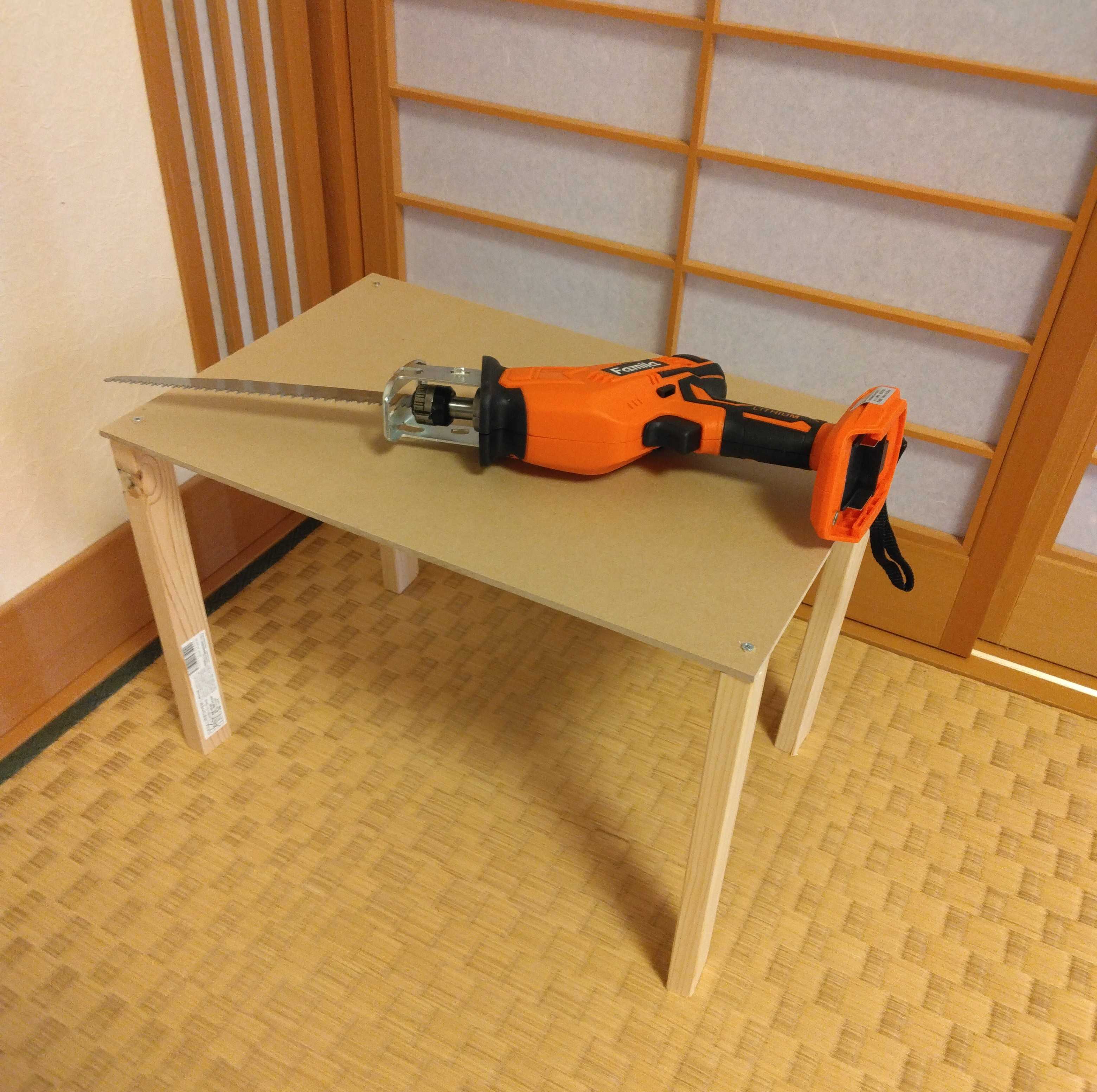 娘の部屋にタンスを運んだがコンセントの都合上 壁から離さざるをえない何度見ても その壁からの隙間が勿体ないそこで隙間に合うように 何かを作ろうと思い立った市販品では合わないし…もともと 越して使わなくなったカラーボックス カーペット等 処分に運ばなきゃいけないが袋に入る大きさに切り刻めば普通のゴミになるそんなことを考えて 自力では無理だから…電動ノコギリを購入した使い方を見ながら まずは充電今なら数千円プラスでバッテリーが追加出来る有れば便利かと追加したが 説明書によると残量の少ない状態で置いておくと動かなくなる?必要なときは多用するが そうでない事の方が…バッテリー 要らなかったかもしれない気を取り直して まず足となるよう木材を4本ノコギリのスィツチを入れて刃を木に当てるが振動に手が震え 思うような場所が切れないコンセントに手が届くよう 床から少し上に物を置くそんなコンセプトで作ったが…電動ノコギリ 甘くなかったでもコレからカラーボックスやカーペットを切らなきゃいけない