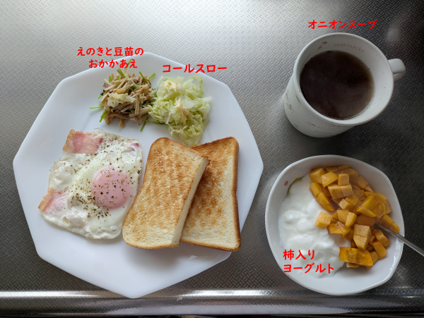 今朝も元気にウォーキング!6時半ごろの朝焼け。早朝は9℃くらいかな?着込んでるせいかあまり寒くは感じなかったです。ただ日中は13℃くらいだったから室内だとちょっと寒いねぇ。。朝ごはん。トースト、目玉焼き.. 他。相変わらず柿が大豊作なので今朝もヨーグルトにカットして入れました。今日の収穫。まだ山ほど実ってます。(^_-)-☆これは母の朝食プレート。内容は私とほぼ同じ。これにごはんとお味噌汁(赤だし)が付きます。(*^-^*)お昼ごはん。冷凍うどんと釜玉うどんの素で・・・温・釜玉うどん 旨豚ニンニク味。冷凍うどんもレンチンだから簡単でヨシ!***今年は葉ぼたんも種から植えたみたいで2種類。こっちは大き目?これは小さいのかな?ガーデニングは母の趣味なのでいつも楽しんでやってます。元気で何より!(^O^)/本日も長い記事にお付き合いいただきありがとうございました猫ブログも書いてますブログ村の3つのランキングに参加してます 応援のクリックをお願い致します