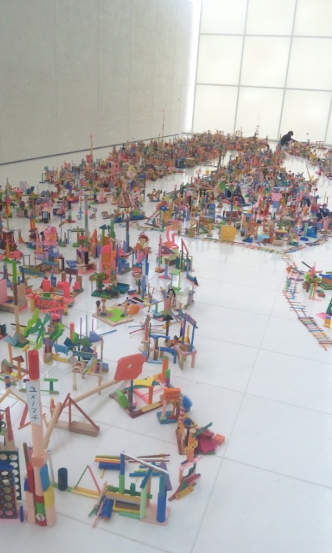岩手県立美術館へ行ってきたのね。 被災した子供たちを元気付ける為に 美術館と来館者と県内沿岸11市町村が様々な思い願いを共有するきっかけとして積み木で建物をつくり、「ユメノマチ」をつくっていくワークショップを行っていたのですって。 館内ではカラフルなユメノマチが広がっていました。 使用済みの積み木に色を塗ったのはボランティアさん達。最初は被災地の子供たちに色を塗らせていたのだそうだけど、思うように水が手に入らない時期、そして子供たちの精神状態が良くなかったのか黒・茶・灰、等の暗い色ばかりを選んで塗っていたのだそう。。。 見かねた職員が色だけでも明るく楽しくなるようにと積み木塗りボランティアが手塗りしたもの。そして、被災地の子供たちが思い思いにユメノマチを建築していった。 この日も来館者にユメノマチ作りに参加させてくれたのだけども、私等は時間が無く、お誘いをやんわり断ってしまった。 作りたかったなぁ。ユメノマチ。イメージする事って素敵だと思うの。イメージすることによって、これから先、どうしたいのか、どうなりたいのかが明確になって夢を実現できるんだと思うのね。子供たちにはとってもユメノマチ作りが励みになったんじゃないかな。 ではまた