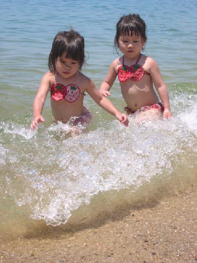 お休みを利用して、福井県の若狭湾へ海水浴へ行きました♪「きれいな海にいきたい! 」って、「すもも」がずっと言っていたから・・・天気にもめぐまれ、本当に、「きれいな海」午前中に、「水晶浜」へ行って、午後には、「水島」へ行きました。「水晶浜」は海がきれいなので有名なところ。海の家もたくさんあって、便利なところです。もちろん、海も透き通っていて、きれい。その「水晶浜」から来るまで20分位、さらに舟に揺られて「水島」です。「水島」は、本当に日本とは思えないくらいの透明な海。遠浅で、水底もはっきりみえます。シュノーケルをもっていった「ももパパ」いわく、 「大きな魚が泳いでいて、もりがあったら、捕まえられそうだ」とのこと。でも、「水島」は陸地からはなれた小さな孤島なので、トイレ以外は何もありません。飲み物などは、持っていかないと大変です。貝も多いので、バンドエードも持って行った方がいいかんじ。海も本当に穏やかで・・・危ないかとおもって、座ることのできる浮き輪を用意して行ったのだけど、「こもも」も「すもも」も、物足りないみたい。チャレンジャーな二人は、泳げないのに、浮き輪もなく海に向かい、波をかぶっていました。素敵な夏の思い出ができました。なのに・・日焼け止めを塗っていたにもかかわらず、ひどい、日焼けで、肩と背中の痛がゆさに耐えている色白「ももママ」にクィック