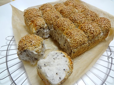 一日中雨で寒かったので旦那さまの部屋着がTシャツハーフパンツから長袖長ズボンになりました。ロングスリーブとロングパンツ? そう言えば長ズボンってあまり言わなくなったかも・・・ 今は『ズボン』より『パンツ』の方が一般的になって来たような気がします。 オーブンを使うと暑くて嫌だな~と言う事がなくなって来たので最近パンばかり作っています。 今日は胡麻入りのパンです。 中に黒胡麻、表面には白胡麻を使っています。 旦那さまはこっち昨日焼いたフランスパンでサンドイッチ入れ過ぎたレタスがこぼれ辛しマヨネーズが流れて見た目がちょっと汚いですがこういうサンドイッチが好きな旦那さまはガツガツ食べていました。 パン生地はHBで1次発酵までおまかせです。パナソニックのHBを使っていますが、レーズンの自動投入ケースがあるのでここに黒胡麻を入れて作ってみました。右の丸いくぼみはドライイースト入れです。後入れタイプのHBです。 1次発酵終了 16個のお団子に刷毛で卵白を塗り白胡麻をまぶしてスクエアケーキ型に並べます。 パンマットを掛けその上に濡らしたタオルをかぶせオーブンの発酵機能で仕上げ発酵します。 発酵終了 オーブンで30分焼いて完成砂場のお団子遊びを思い出す楽しいパン作業でした ラ王の袋麺塩味を食べてみました。 西京味噌のような黄色い色の塩ダレ透明感のある鶏むね肉の塩スープ 油も少なめなマイルドな味と言う感想です。冷凍ブロッコリーを入れてしまったので何も入れなかった場合と比べると若干色が違うかもしれません。ラ王の醤油を初めて食べた時の感動はありませんでした。 収納ボックス購入しました。Mサイズ5個セットの他にSサイズもついでに 買いましたが柄は全てサファリにしました 月曜日は久しぶりに晴れ間が見られそうです。寝室の洋服の入替えが全く出来なかったので早く終わらせたいですがこれは旦那さま次第です・・・お願いですから昼間は起きていてください ご訪問ありがとうございました
