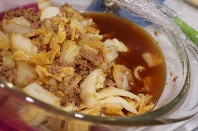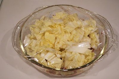 肉の上に白菜を乗せてラップしてレンジで3分
