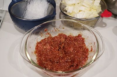 解凍した豚ひき肉150gに調味料を絡めます。