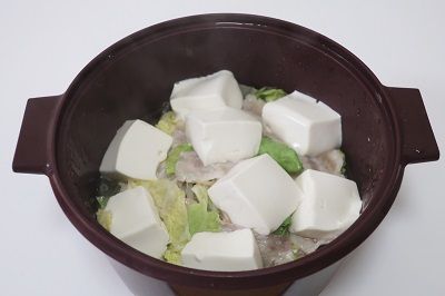 沸騰してきたら木綿豆腐を手で千切りながら入れます。
