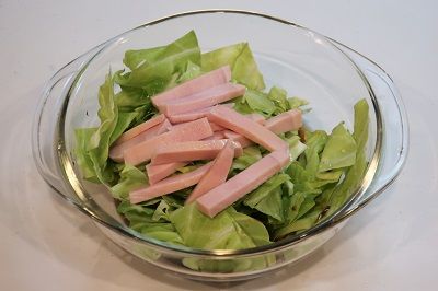 材料はキャベツ・ハム・めんつゆ・水