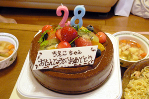 先日、後輩の女の子の誕生日会をしました!28歳…若っっっ!!!!今も楽しいけど、楽しかったな…28歳…夜の10時まで兵庫県の友達の家でパーティをして、みんなそろそろ帰ろうかと…その後輩の電話がリーンリーン(今時、そんな音はせ~へんけど…)『あ、今からそっち行くわ!(ミナミ)』え??今から?今から大阪に帰ったら、夜の0時でっせ!ミナミ着いたら、0時半ごろになりまっせ~!!!やっぱり、若いなぁ…その元気、少し私にもプリーズ!とにもかくにも、おめでと♪
