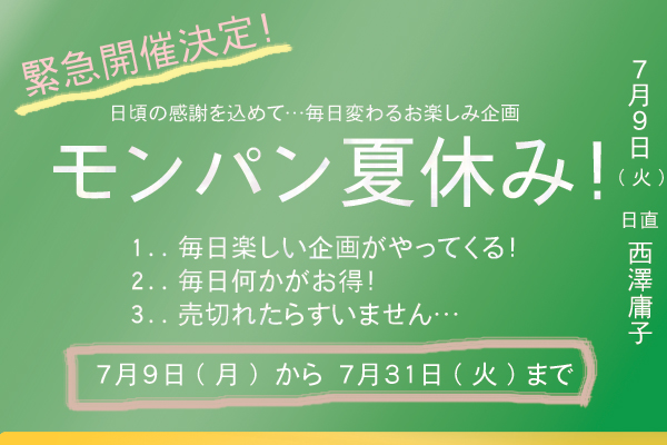 やって来ました!夏休み企画♪自分でもかなり笑える…そんな写真が出てもいいのか?私…めっきり夏休みがなくなった今日この頃…モンパン店内で夏休みを作っちゃいましたよ♪♪♪何かが起こる予感!7月9日のキーワードは…30!!お楽しみに~~~♪