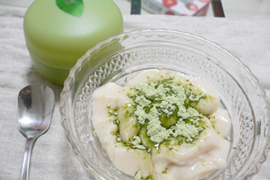 和菓子の千鳥屋が家の近所に出来た。なんだかちょっとうれしくて、一人で会社帰りに行ってみた。おっ♪これ、おいしそ~!豆乳プリンを1つだけ購入。(1つってセコイ?)家に帰って冷やして早速パクッ。おいすぃーーー!(~0~)何てったって、抹茶の粉が最高!豆乳好きの人は絶対におすすめ♪♪♪やわらかプリンの豆乳版。夏限定なのかな?で、1個しか買って来てないので、もちろんこっそり食べたけど、入れ物を何かに使えるかな?と洗って置いてたら、旦那様…『何入ってたん?何入ってたん?自分だけ??』…とスネてたwちょっとしつこかった。。。でも、まだ何が入ってたかは言ってません(笑)