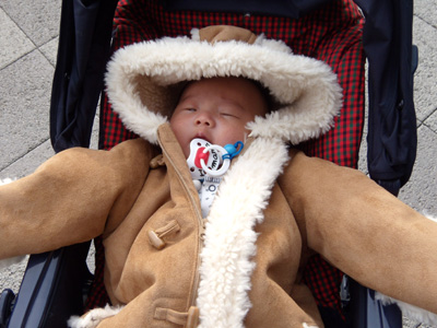 今日のお出かけはお天気がよかったので、とってもいい気持ちでした( ´з`)ノ⌒☆まぶしそうな凌くんですが、ご機嫌は↑↑↑ふわふわのコートは私の妹(通称おばこ)からのプレゼント♪