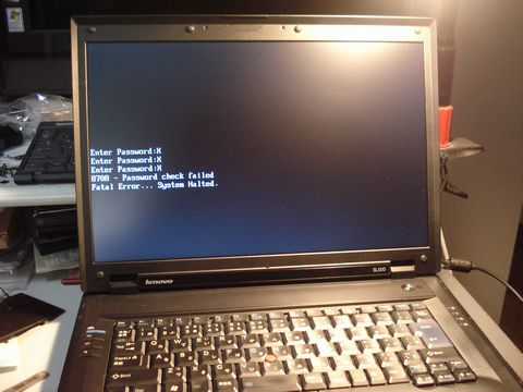 このSL500(2746-RP1)は、残念ながらSVP(スーパーバイザーパスワード)が設定されている。ENTERキーを押してもパスできないことから、POP(パワーオンパスワード)も設定されているようだ。ただ、POPはボタン電池を外して起動すればクリアできるので、ボタン電池を外してSL500のBIOSに入ってみる。BIOSのバージョンは「6AET58WW(1.24)」。CPUはCore2Duo/P8700を載っていることが確認できた。メモリーは512MBとちょっと非力。※SVPが設定されているSL500。POPも設定されているためパスして起動できない。※パームレスト下のC-MOSバックアップ電池。これを外して起動するとPOPは解除できる。※バックアップ電池を外したので、日付・時刻がクリアされてエラーメッセージが表示される。※参照しかできないがBIOSを起動させることができたSL500(2746-RP1) BIOSには入れるようにはなったが、設定を変えることができないので、OSを起動させることができない。前回同様、EEPROMの貼り換えをすることにした。 ドナーは、バックライトが点灯しないSL500のシスボ。チップフューズの溶断が発見されたが、短絡してみても復旧させることができなかった代物だ。 SL500のBIOSやSVPは、シスボのトラックポインタのコネクタ近くに実装されているEEPROM「MX25L8005M2C-15G」に保存されている。これを貼り換えてしまえば、このSL500を復活させることができる。※SL500のEEPROMの所在。「MX25L8005M2C-15G」と刻印されている。(外し方は、前回の記事にあるので省略…) さて、EEPROMの貼り換えが終了したので、早速起動させてみる…。 しかし…。 なんと、POST画面でフリーズ…。※EEPROMを貼り換え後POST画面でフリーズ。半田付けが甘かったのか?それとも…。 これは…。 EEPROMの半田付けが甘かったのか…。あるいは熱でEEPROMを破壊してしまったのか…。 ブルーな気持ちになったが、これと同じような画面を以前目にしたことがあったぞ! …そうだ。BIOSがCPUに対応していないのだ。 このSL500(2746-RP1)のCPUはCore2Duo/P8700。取り外し前のEEPROMに納められたBIOS「6AET58WW(1.24)」は当然、このCPUに対応している。 では、ドナーとなったSL500(2746-26J)のBIOSバージョンは何だったのか? 初期画面の表示を見ると、BIOSのバージョンは「6AET41WW(1.07)」であることが分かる。これでは、P8700に対応していなくても当然だろう。 そこで、CPUを余っているCeleron/900に換装。 しかし、これでもフリーズ。あれれ?※CPUをCore2DuoからCeleronに換えたのにやっぱりフリーズ。原因は半田付けか? やはり半田付けが甘いのだろうか。もう一度EEPROMを取り外して、取り付け直してみる。でも、起動させることはできない。 しかし、冷静に考えてみて、まさかとは思ったが、Celeron/900も対応していないって可能性もあると考えた。 ではレベルをもっと落として…、と思ったけど、すぐに使えるのはCeleron/T1600だけ。これも対応していない可能性もあるが、とりあえず換装して起動させてみた。(これで動作しないと、正常品からCPUを抜かなければならなくなる…) 結果、やっとBIOS画面を見ることができました…。※CPUをCeleron/T1600に換装して、やっとBIOSを拝むことができました…。 よおし!やっと動いたので、BIOSを更新して、Core2Duo/P8700が載せられるようにしておこうっと…。