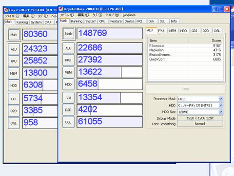 ※左、T61(6463-5BJ)。右、T61p(6459-A13)によるCrystalMarkの結果。