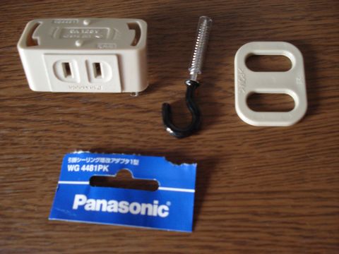 引っ掛けシーリング自体は、ホームセンターで100~150円程度で手に入れることができる。今回は、丸型の引っ掛けシーリングを用意した。(丸型は角型に比べて取り付けネジの間隔が広いため、安定して天井に取り付けることができる。)