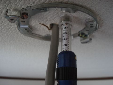 使い方は至って簡単。打音であたりをつけた場所に刺すだけ。下地があるとそこでとまり、刺さらなくなるのだ。我が家の天井では12mmほど刺さったところでとまったので、ここにネジをうてばいいことになる。(下地がないところで試したら、簡単に全部刺さってしまった…。)