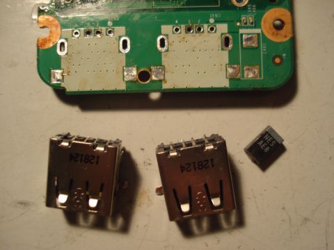 しばらくすると、半田が溶けて光るように見えるので、そこでピンセットを使ってUSBポートを引き抜いた。