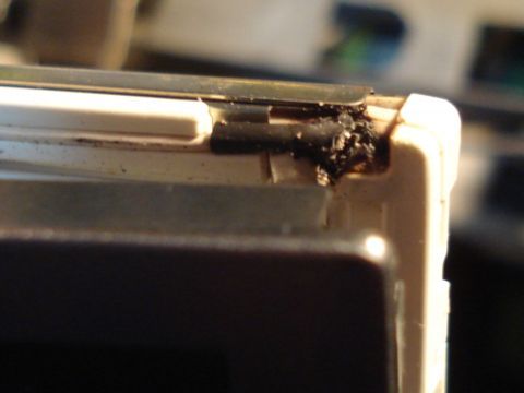 そこでCCFLを取り出すべく液晶ユニットを分解。スチールの液晶フレームを外してみると、なんとCCFLの極(端子)部分が焼け落ちていた。(絶縁用の熱収縮チューブや端子カバーも焼けただれてしまっている。これは、 端子との接続部分の導線に無理なストレスがかかったために、抵抗値が高くなり発熱・一部断線し、発火してしまったものと思われる。)