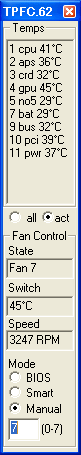thnkwikiのリンクを使って、TPFanControlV062 (TPFC)をインストール。[BIOS][Smart][Manual]という三つの動作モードがあって、初期設定は、[Smart]だけど、これを[Manual]に変更。Fanの回転を最高の[7]に設定した。 (これにより、CPUファンは監視温度に関係なく常に回り続けるようだ。) [BIOS] BIOSの標準設定。45度でファンが動作するように設定されている。 [Smart] iniファイルで設定された温度でファンが動作します。標準設定は65度のようです。 [Manual] ファン回転数を手動設定できる。 一番左:TPFC導入直後。 cpu・gpuとも50度以上の温度を示している。 2番目:再起動後。 TPFCが起動直後から稼動した状態では、cpu・gpuの温度が50度以下になっている。(動画再生など使用するソフトによっては、GPUの温度が60度近くまで上昇してしまいます。) |