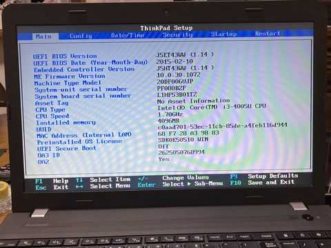 こちらは、フロントカバー(液晶フレームカバー)とバッテリが欠品のロックがかかったE550。電源を入れると、boot画面になるが、[F1]でBIOSに入ろうとすると、パスワードを求められる。つまり、SVPが設定されているため、BIOSの変更ができない状態だ った。