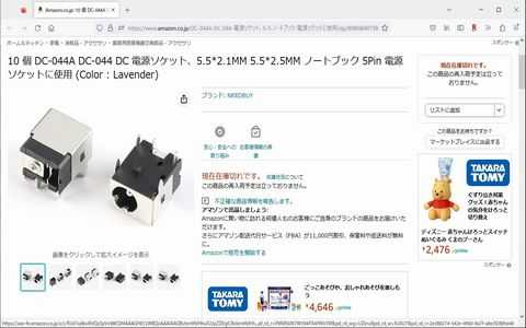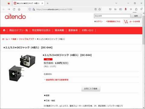 調べてみると、このDCジャック「DC power jack socket connector DC044A」というもののようだ。Amazonも検索でヒットしたが、在庫切れ・再入荷の予定はないみたいだ。