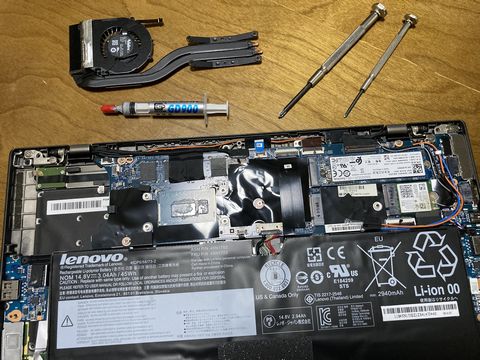※底蓋、CPUファンを外したX1。キーボードを交換するには、さらにシスボとバッテリーパックを取り外す必要がある。