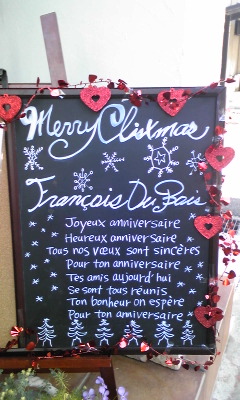 本当なら昨夜から東京に行き、クリスマスパーティ2つに参加する予定が。残業により、泣く泣く断念。今朝、目覚めると外は雪が舞ってました。あらら、でも大したことなさそう念のためにタクシーを呼んで駅まで行くことにしたのですが・・・駅に着くと新幹線が大幅に遅延している「チケットを持っている方は駅員に言ってください!お急ぎください」アナウンスが流れていたので、慌ててホームに立ってる駅員さんに交換してもらって飛び乗りました。今日のパーティは師匠のバースデーパーティ&忘年会会場は九品仏のブルターニュ料理専門店。「poete bonheur」デス駅から凄く近いのに道に迷いましたこれが前菜で、ムール、チキン、ガレッドとボリューム満点のお料理はどれも美味しかったです最後にケーキが3種類食べすぎです。。。プレゼント交換をして、2次会へ。近くのカフェで総勢17名ワタシはEさんとMさんと3人で話し込んでいました。スゴク楽しい一日でした明日はのんびりしたいな。。。