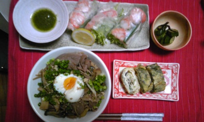 久しぶり?にまともなご飯を生春巻きに仙台味噌入りバジルペースト(某ホテル特製らしい)をつけたら・・・イタリアンな感じで美味しい~チリソースだとエスニックになるし、生春巻きはいろいろ楽しめるところが好きデス