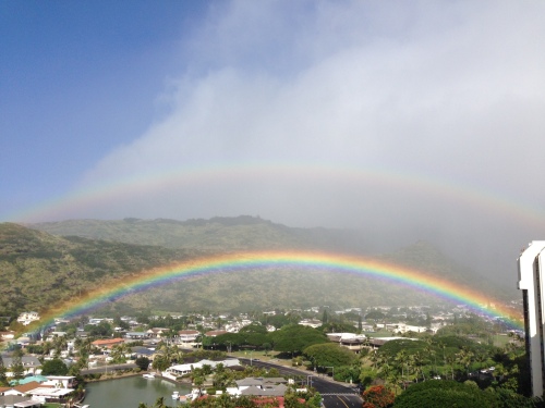 冷たい雨が降ったり止んだりの毎日で流石の楽園ハワイでも少々憂鬱になります。でも一日に何回も虹が見られるので憂鬱は長続きしません。朝はリビングルーム(西側)からダブル・レインボーが見れ午後はベッドルーム(東側)から大きなアーチの虹が見れて幸せな気分になります。どうやら明日から数日は強風は続くけど雨が降らないようです。今晩は上弦の月笑った口に見えますよね。今日も錦織くんが勝って良い一日でした。