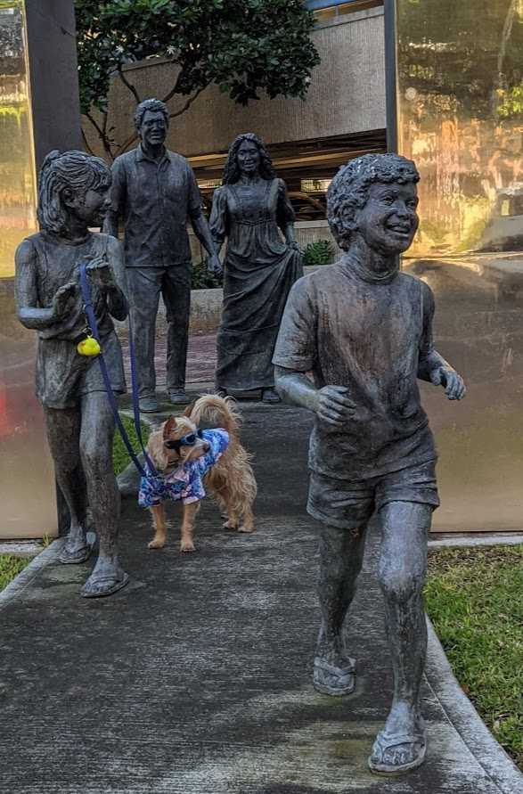 雨が上がってから、朝の散歩に出たけど貿易雨に降ったりやんだり、雨宿りをしながらの散歩になってしまった。それにしても 空気が冷たいから濡れるとクシャミが出る。(だって21~2℃だったもの...ハワイ住民には寒い)マスクをしていて本当に良かったわ。イオラニ宮殿はどの門も閉鎖しています。お隣のハワイ州議事堂はトランプ支持者たちでなくタロイモ農家のプロテスト芝に千本のハワイ州旗を立てて、農家救済を求めていました。🦊タロイモって紫のイモだよね?ボク野菜は好きじゃないんだよ。タロイモ、私は食べていますよ。でも、サツマイモやスイートポテトを買う事の方が多いですね。🦊小雨降っているんじゃない?レンズに水滴が…😎トランプ支持者が数人現れたけど、この農家のプロテストに圧倒されて、スコスコと去って行ったらしいです。バイデン大統領就任の日に ハワイ州旗‼ ハワイ最強‼