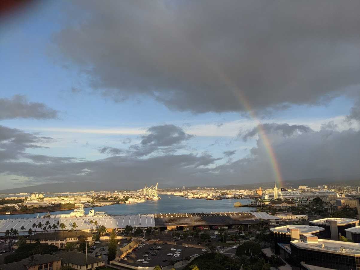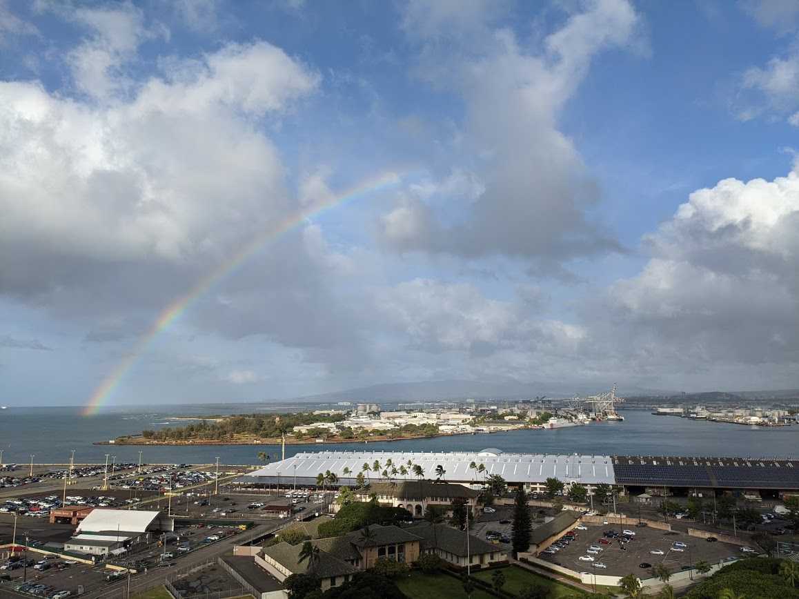 カカアコ・ファーマーズマーケットは8時オープン私達が到着した7時20分には、未だセットアップされていないベンダーもあったけど人気のフィリピン農家のテントは既に行列が出来ていました。此処と花+野菜(ハーブ?)を売る店だけ行列ができていて他の店は並ばなくても大丈夫なようでしたね。🦊生肉のニオイがする写真を撮る人がいるとポーズをとるキアヌ購入したのはケール、大根、ゴーヤ、パパイヤ、竜眼この竜眼、滅茶苦茶甘くて美味しかった‼ランチは$6丼とおむすび$2.50やっぱり$5弁当が一番お得感があるわ。そして「つるとんたん」ファーマーズマーケットを去る時(8時頃)人出が徐々に増えてきていました。雨に降られたけど、キアヌも雨具の準備していたから雨季のハワイの朝は貿易雨+🌈が定番。さて雨がパラつく中 ファーマーズマーケット近くのホールフーズへお気に入りブランドのヨーグルト 無しゴートミルク(山羊乳) 無し別のブランドのヨーグルトとアイスクリームを購入しただけなんだけどエクスプレス・レジは開いていず、普通のレジも3カ所だけオープン。店内ガラガラだったのに、支払いレジで列ができていたのは客がレジ台で買った物をエコバッグに詰めるから、時間がかかっていたからみたい。店員が少ない...週末なのに客が少ない...朝8時だったからなんでしょうね。これなら、買い物に来てもそれ程心配することは無いかも。ネット注文して配達してもらっても注文した「肝心な物」がないと落胆しますよ。時には献立に支障をきたしますよね。お好み焼きを焼く予定だったのにキャベツが無かったりしたら...これから また土曜日にファーマーズマーケット+ホールフーズで買い物することにしようかしらねぇ。さて帰りは雨が止んで...🌈帰宅したらキッチンの窓からも🌈午後も🌈今日の虹は低位置でしたね。==============================チャイナタウンで早朝、腕と脚を拳銃で撃たれた男性がいて、その近くのカリヒ地区(コスコなどがある)ではガードレールを飛び越えた車が住宅に落下。(不幸中の幸い死亡者ゼロ)そしてパールシティー地区ではモーターバイクを所有者の敷地から盗む様子がTVに流れていました。周囲を気にしているけど、防犯カメラは気にしていないのね。ホノルル... 良いニュースないですね。そして我が家... 先月から次々と物が故障していて今回は自動ソープディスペンサー。二つ壊れた‼二つですよ!三個あるうちの二個。購入して未だ一年...新しい電池と交換しても ソープが出てこない。そして、ジョンのPC...先週 Ω\ζ°)チーン成仏したのとは別のが 調子悪い。我が家も良いニュースないですね~。でも悪い事ばかり続かないだろうから、そろそろ良いニュースがあっても良い時期。コロナが収束してくれるのが一番うれしいニュースなのですが私のコレストロール数値下がっているとか… そんなことでも良いわ。