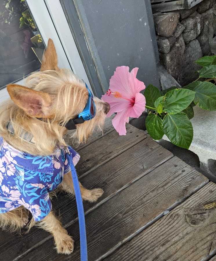 🦊ボクだって花を愛でるんだよ~今日はお天気が好くなったけど、時々大粒の雨粒が風に運ばれてきていたわ。🌈は無し…🦊あの人何をしているのかな?それより濡れた芝が嫌いなんでしょう?未だ湿っている芝に伏せ?(家に帰りたくないのよね~。)🦊壁を昇っている公衆トイレの屋根に上りましたね。屋根が彼の寝場所??最近、近くの公園で屯しているホームレスは、若者ばかり。しかも、皆さん、バックパックだけの身軽な姿…。不思議なんですよね~。私は勝手に「彼らはクスリの売買をしている」と考えていますが…違っていたらごめんなさい。でもねぇ~。毎朝、ゴミが散在しているし、児童公園で遊ぶ家族がいなくなったのは彼らのせいだし==========================久しぶりに出会った🐶友(28歳👨)が「(有名な)投資信託会社に再就職が決まり、明日から出勤する」私は彼が就活していたのを知らなかったけど本当に良かったわ~~。コロナ不況でも 新入社員採用する余裕がある会社が ハワイにもあるのね~。それにしても半年以上、会っていない🐶友たちでインスタグラムもフェイスブックをしていない人たちは現在どうしているのか全然わからないわ。======================月曜日が休日だったから今週がいつもより早く過ぎました。もう木曜日…明日は「アロハ フライディ」「今週の日本語」これを選んだのは学生でしょうね。